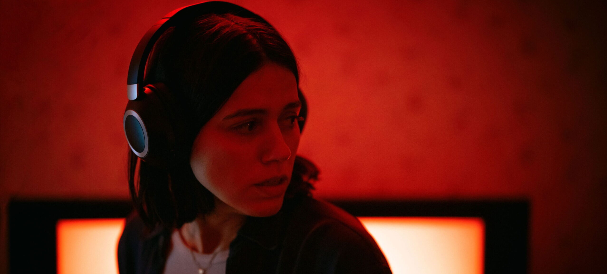 Strained by the responsibility of providing end-of-life care to her dying mother, Evy (Nina Kiri) seeks respite from the loneliness of her fragmented reality. Now living in a house full of sentimental keepsakes and memories, her sanity and structure lies within her work on a supernatural podcast, The Undertone. While she usually plays skeptic to the creepy (and often disturbing) audio files sent to her by co-host Justin (Adam DiMarco) for podcast fodder, the latest submission hits differently. A series of 10 unheard recordings from a young pregnant couple are unfurled one by one, each more ominous than the last. As Evy draws parallels to her current plight, hidden messages manifest, pushing her further toward madness.